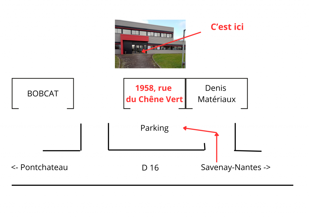 Le bâtiment est situé entre « Denis Matériaux » et « Bobcat », des places de stationnement sont disponibles devant celui-ci.